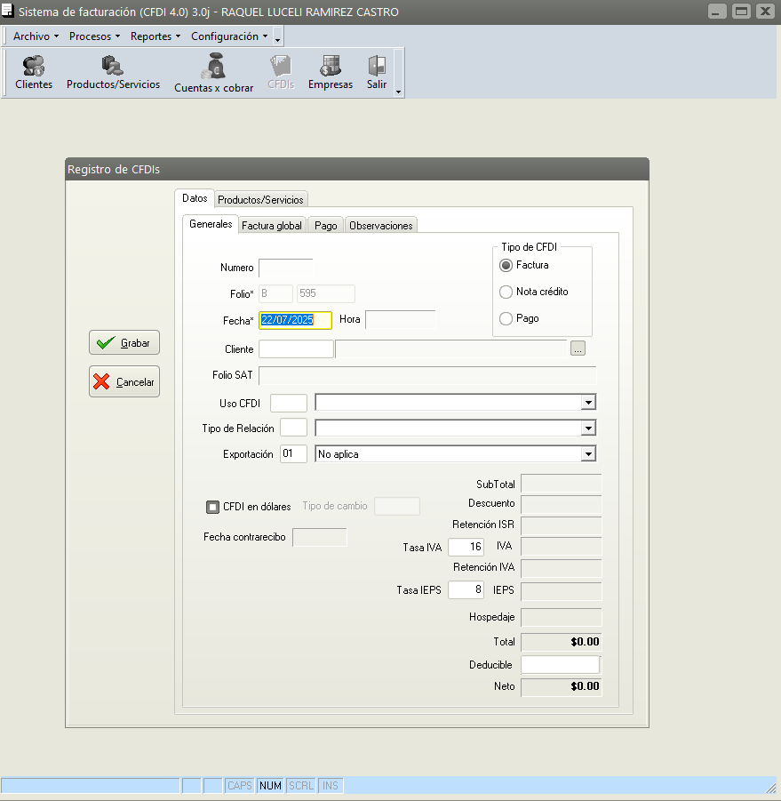 Aplicación en Windows para elaborar comprobantes CFDI como facturas, recibos de Arrendamiento y de Honorarios, Notas de crédito y comprobantes de Pago, cuenta con sistema de cuentas por cobrar que permite emitir antiguedad de saldos, pendientes por cobrar, saldos por cliente, etc.